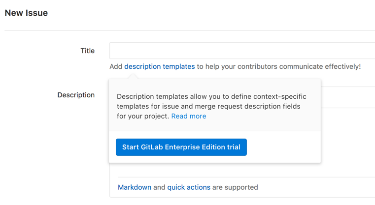 This example shows two sections, where each section includes an actionable element. The first section shows a summary of the content shown when clicking the "read more" link. With this information the user can decide to dive deeper or start their GitLab Enterprise Edition trial immediately.