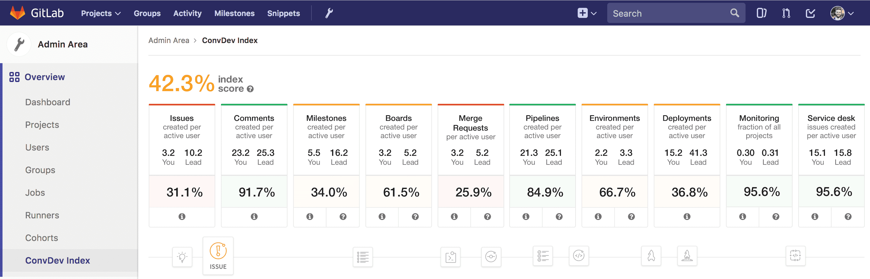 Conversational Development Index (ConvDev) gives you an overview of your entire instance's feature usage, from idea to production. It looks at your usage in the past 30 days, averaged over the number of active users in that time period. It also provides a lead score per feature, which is calculated based on GitLab's analysis of top performing instances, based on usage ping data that GitLab has collected. Your score is compared to the lead score, expressed as a percentage. The overall index score is an average over all your feature scores.